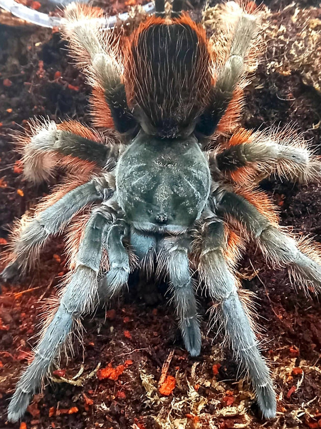 This slow-growing species displays a sleek black body contrasted by rich reddish hairs on the abdomen and subtle slate-blue tones on the legs. Native to Mexico, it tends to be calm and reclusive, making it a good option for those who prefer a low-maintenance tarantula with long lifespan potential. Adults reach around 4–5" and are known for their gentle nature and hardy disposition. A solid choice for both beginners and collectors who appreciate understated beauty.