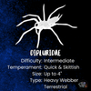 This striking funnel-web tarantula sports a sleek black body adorned with vivid golden striping along its legs and abdomen. Known for its speed and heavy webbing, this species creates elaborate silk tunnels throughout its enclosure. While it tends to be secretive, it makes up for it with bold feeding responses and an impressive appearance. A fantastic option for those who enjoy active Webbers with unique coloration!