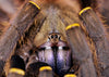 As adults they get bright purple fangs, have an olive colored body and yellow bands on their legs.