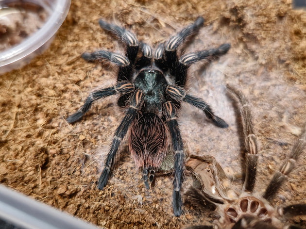 This deep green coloration is very rarely seen in the tarantula world, and even more rare to see it coupled with orange knees!