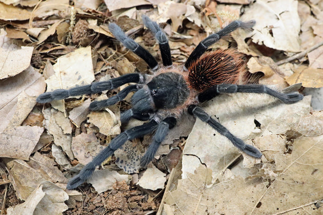 This large terrestrial species from Panama features a beautiful black legs and carapace with an abdomen that has a black base and long red hairs.