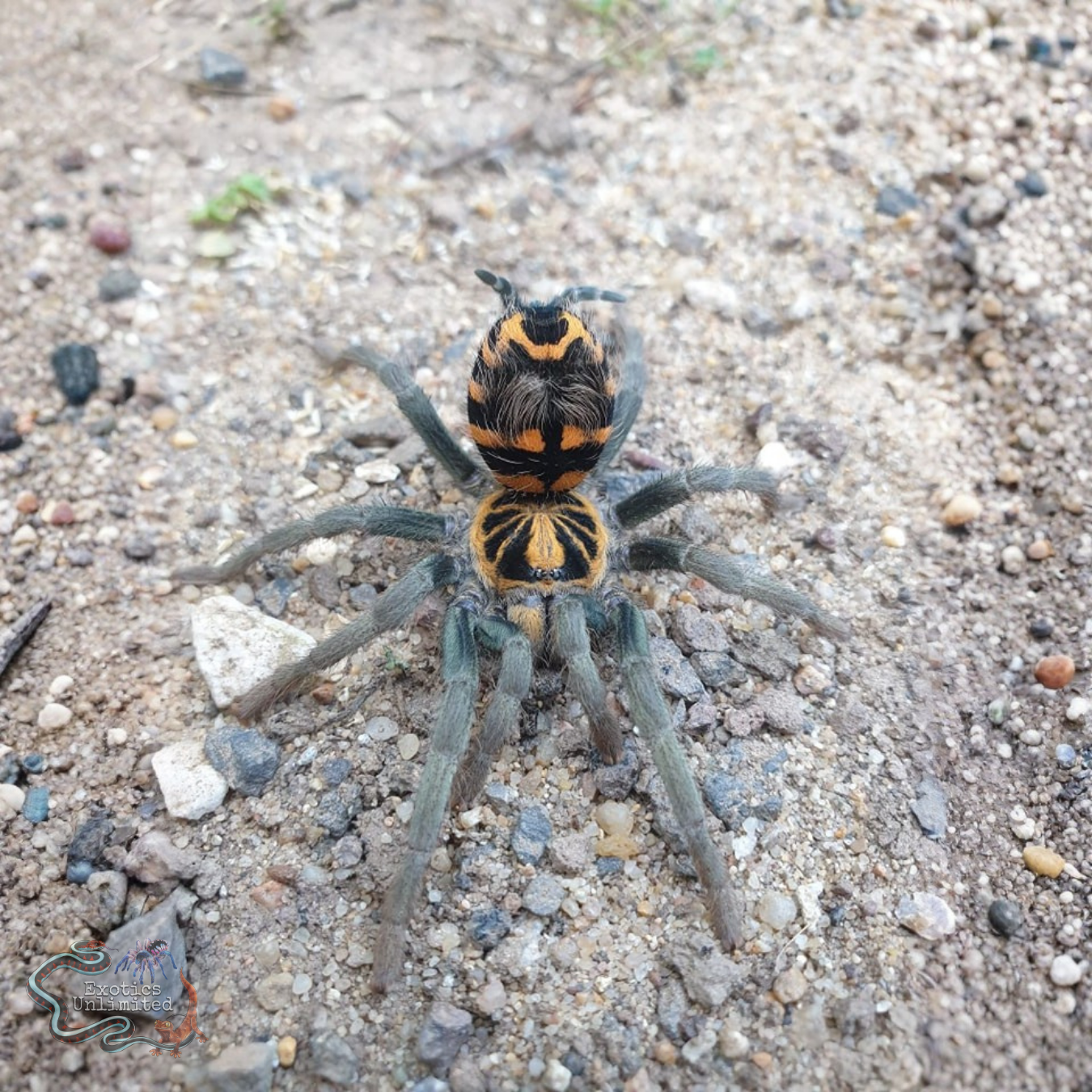 This newly described species from Ecuador shows bright yellow-orange and black coloration with a distinctive crowned pattern. It’s a small terrestrial tarantula reaching about 4", and it is considered a very rare species—with these being among the first specimens to arrive in the USA.