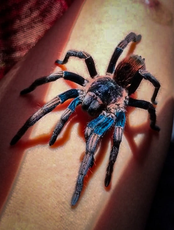 This stunning terrestrial species features bright blue femurs with pink stripes on the legs and a bright orange abdomen with a pink ring around the carapace.Â