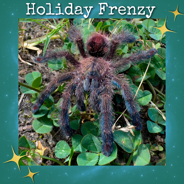 This unique species is such a fun one to grow out! It starts as an emerald jewel green sling, develops gorgeous blue, red, and green striping as a juvenile, and matures into a stunning tarantula with bright blue and red legs, a golden carapace, and chevron patterning. No wonder this species flies off the shelf every time it's available!